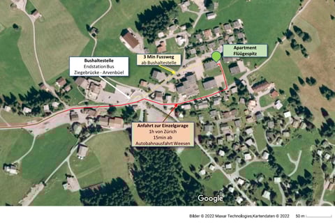 Anfahrt über die Autobahn A3 (Zürich - Chur). Ausfahrt Weesen/Amden nehmen und durch die Ortschaften Weesen und Amden bis Arvenbüel fahren. Am Ende der Strasse wie oben dargestellt (rote Linie) zur Einzelgarage (Nr. 21 fahren).
